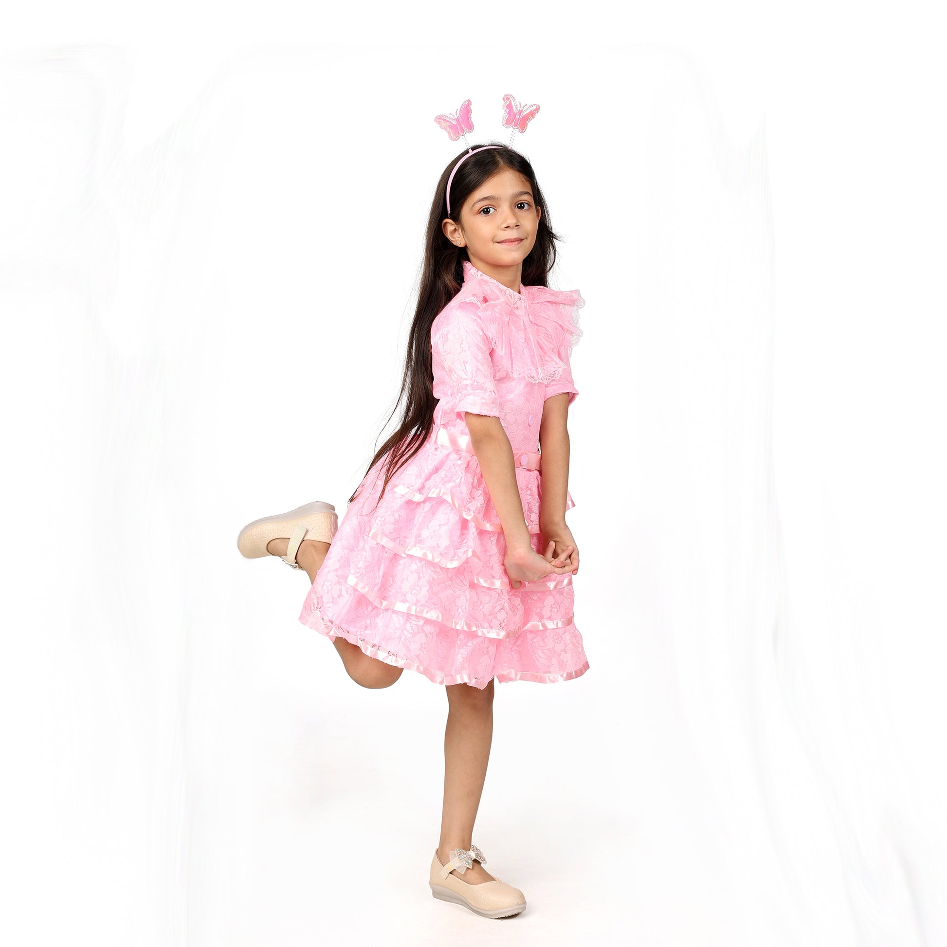 Itsmycostume Net Casual Knee Length Cute Frill Fairy Pink Frock Dress with Wings, Fairy Stick and Head Band for Girls Kids