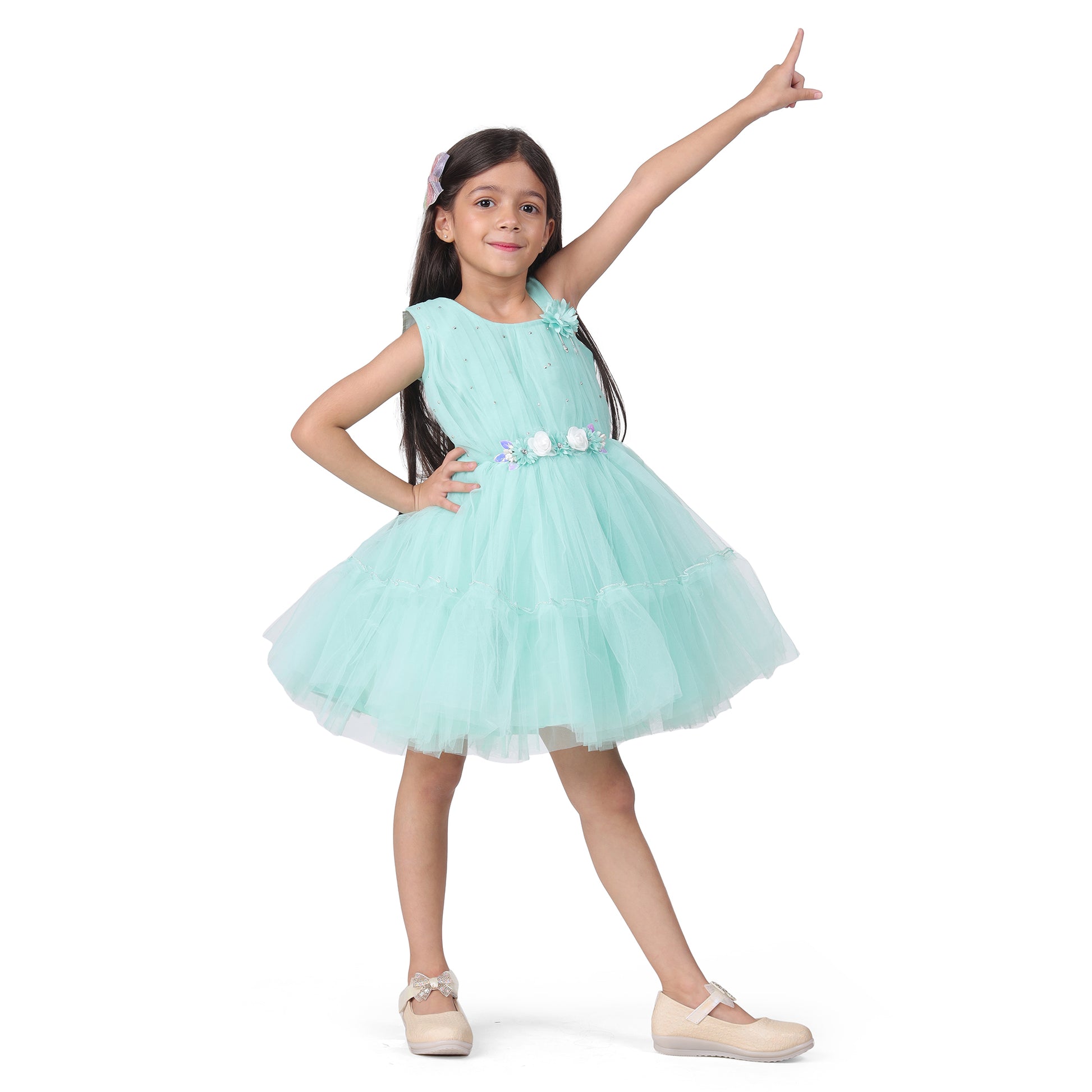 Itsmycostume Net Casual Knee Length Cute Frill Green Frock Dress for Girls Kids