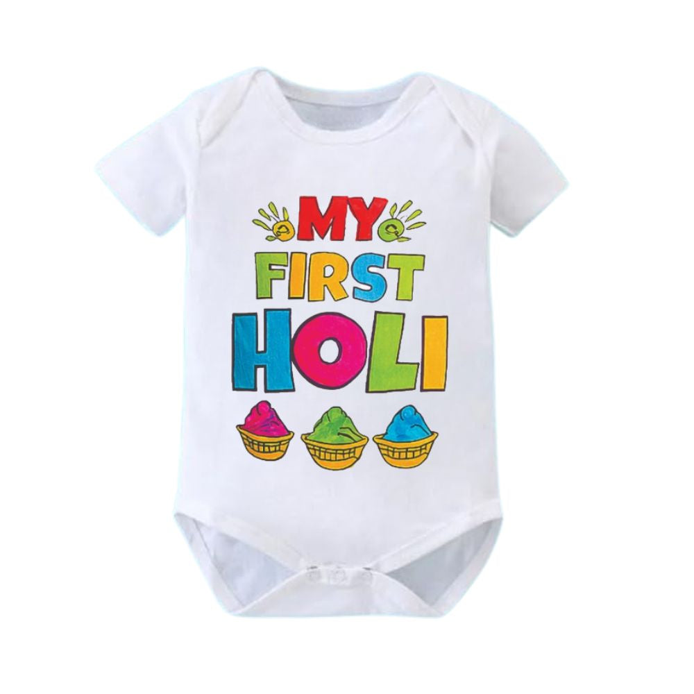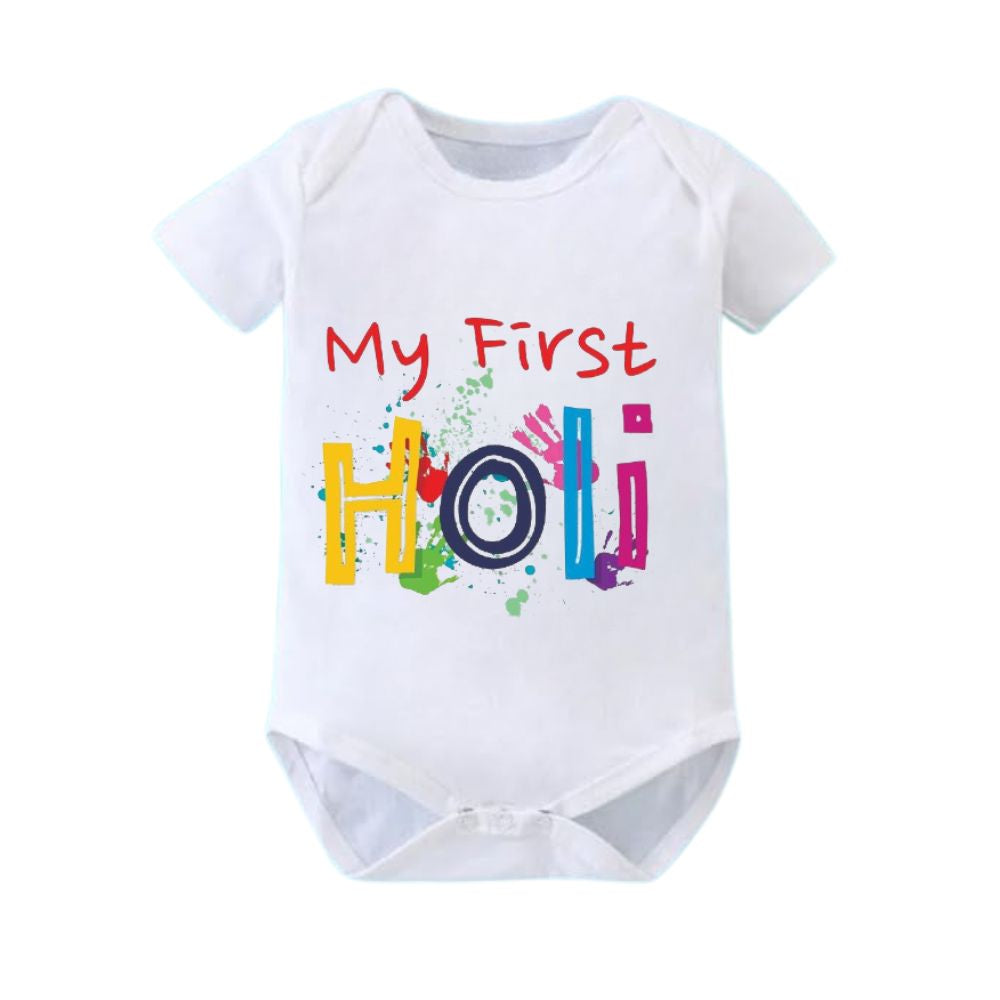 My First Holi Dress For Baby | New Born Boy Girl Romper Bodysuit Cotton White Half Sleeves Clothes | Holi Celebration Photoshoot