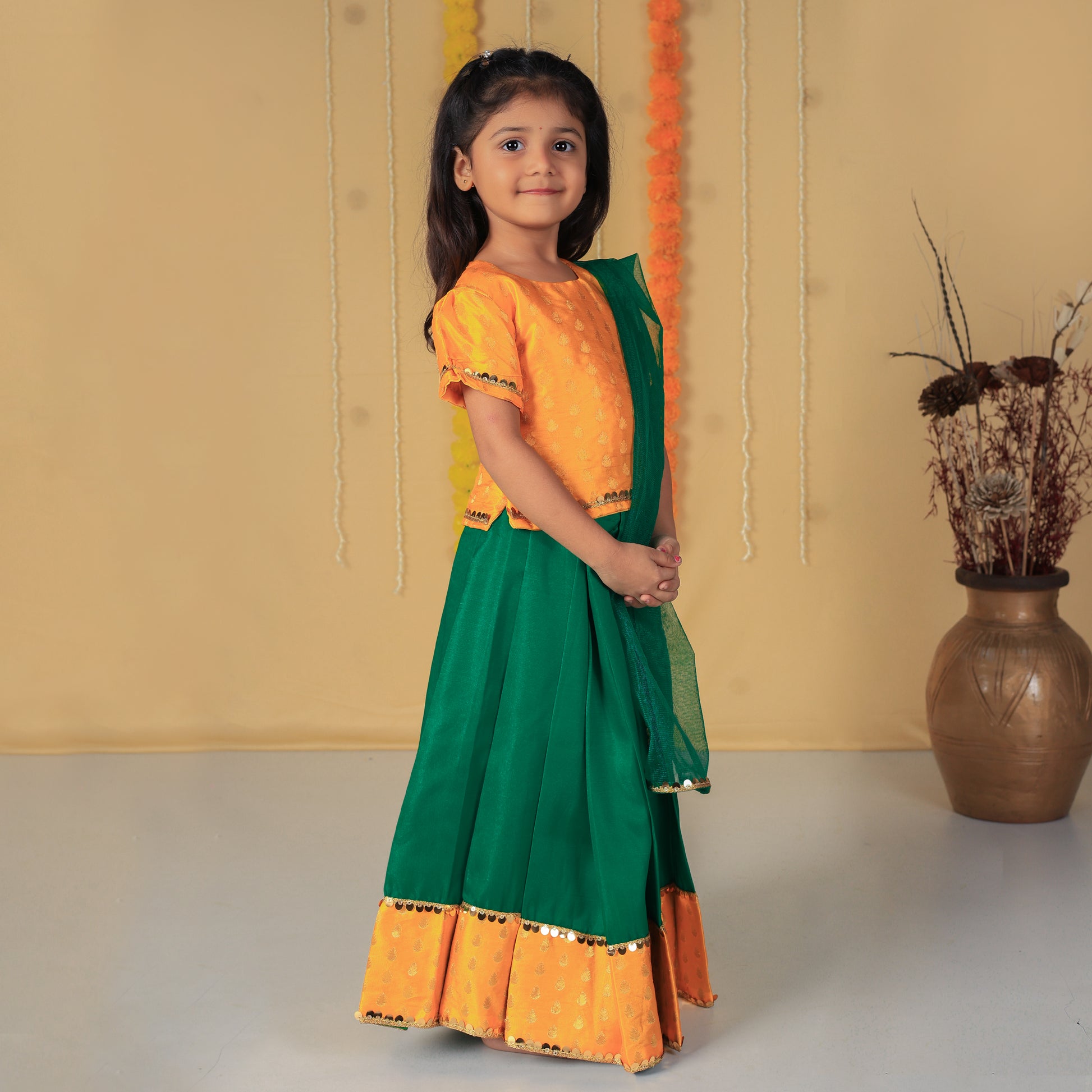 Vaanee Designz Silk Blend Readymade Embroidered 3 Piece Lehenga Choli Set|Lehenga Choli,Ethnic Wear|Lehenga for Kids|Lehenga Set for Wedding and Festival(Yellow & Green)